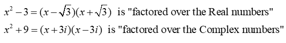"factoring over the Real numbers" and "factoring over the Complex numbers."