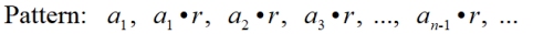 Pattern: a, a • r, a • r2, a • r3, ... where a is the first term. |
