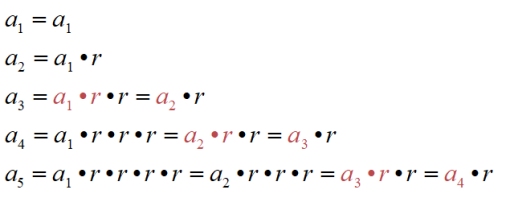 The origin of this recursive formula for a geometric sequence, where the common ratio is r, can be found by examining the geometric sequence's pattern, from its definition.