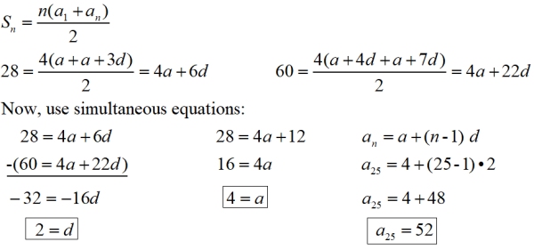 Simplifying: 30 = a + 4d and 86 = a + 11d