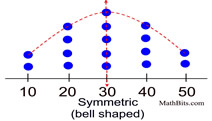 Symmetric (bell shaped) - when graphed, a vertical line drawn at the center will form mirror images, with the left half of the graph being the mirror image of the right half of the graph. In the histogram and dot plot, this shape is referred to as being a "bell shape" or a "mound". The most typical symmetric histogram or dot plot has the highest vertical column in the center. This shape is often referred to as being a "normal curve" (or normal distribution). Not all symmetric graphs, however, have this shape (see Symmetric U-shaped below).