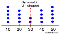 Symmetric (U-shaped) - as mentioned above, a symmetric graph forms a mirror image of itself when reflected in its vertical center line. Unlike the previous graphs, these histograms and dot plots have more of a U shape.
