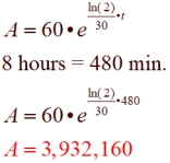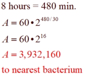 You can see this simplified formula at work in the computations on the left, to solve for k. Using this solution, establish a specific equation for this bacteria. Solve for the "end result", A, using time (t) to be 96 minutes. Round to nearest whole bacterium.