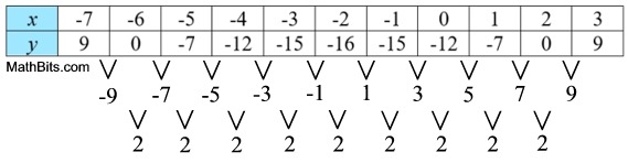 • The table can show where the zeros (roots, x-intercepts) are located (look for y = 0, such as at at x = 2 and x = -6).